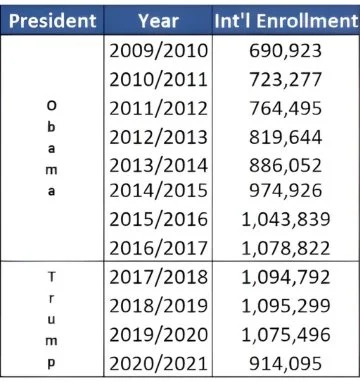 Let’s break down the numbers: Here are the total international enrollments in the United States as reported by Open Doors, grouped by president.